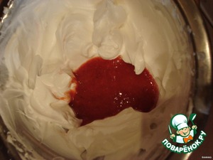 Сливки взбиваем миксером до устойчивой пены и перемешиваем с сахарной пудрой и клубничным пюре.