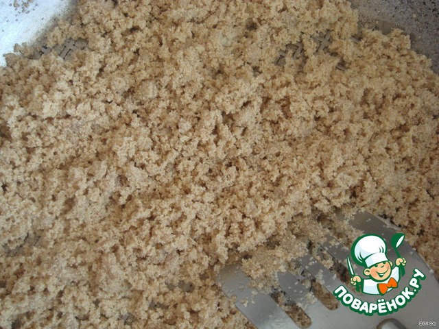 Как только сахар стал коричневым всыпаем манку. Имейте в виду, что манка увеличится в размерах примерно в три раза. Масла должно быть такое количество, чтобы при перемешивании манки она не становилась кашей, а оставалась сухой, но при этом вся промасленная. Постоянно мешайте. По виду, правильно готовящаяся олва напоминает песочное тесто.