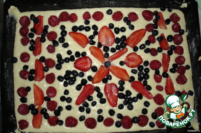 Сверху раскладываем клубнику, малину и чернику, вдавливая, чтобы ягоды провалились в тесто.