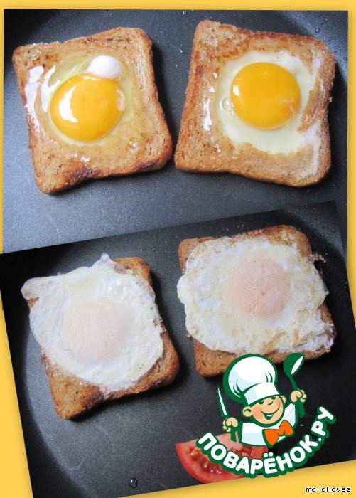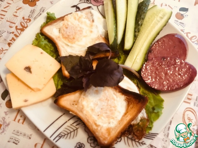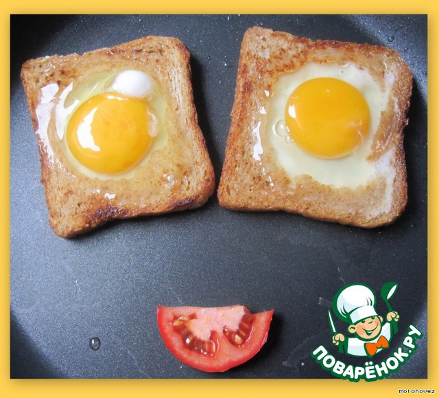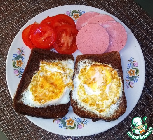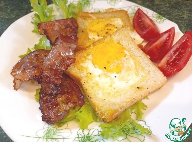 В интернете пишут, что это блюдо имеет американские корни и называется по-английски Egg in the Hole или Egg in the Basket - "яйцо в дырке" или "яйцо в корзинке". Американцы предпочитают такие яйца довольно долго держать на сковородке, чтобы они преобрели "крутую" консистенцию и едят с кетчупом и жареным беконом. Кругляшок вырезанного хлеба, они также подсушивают на сковороде и как крышкой прикрывают им яйцо в хлебе, как бы для "сюрприза".