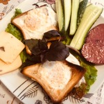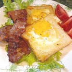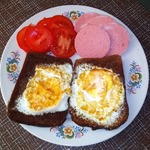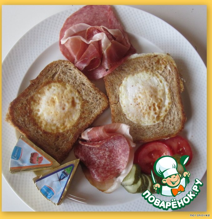 Это я опять об утренних блюдах из яиц! Говорят, что на сайте уже были рецепты основы моих бутербродов и они назывались "Завтрак холостяка". По-немецки же название этого рецепта звучит "Ei guckt durch Loch", что на русский язык переводить я постеснялась...