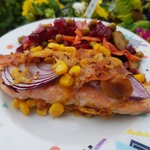 Вино, чеснок, масло, сок лайма, соль смешиваем, поливаем рыбу, высыпаем кукурузу - и в духовку. Закрыть крышкой, тушить минут 35, затем крышку открываем и посыпаем сыром и петрушкой и тушим уже без крышки еще 10 -15 минут.