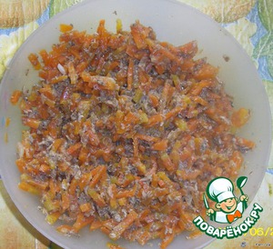 Затем лук убираем и на этом же масле обжариваем вареную морковочку, совсем немного