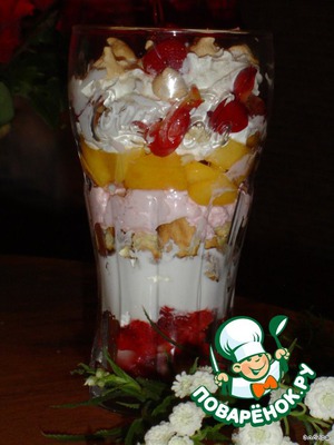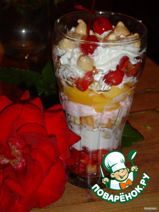 В высокий стакан положите кубики фруктов, на них - соломку, измельченные орехи и меренги. Сверху уложите взбитые сливки, затем опять фрукты, на них - сливки с клубничным пюре. Так чередуем слои и сверху заливаем ванильным соусом. Оформляем вишенками.