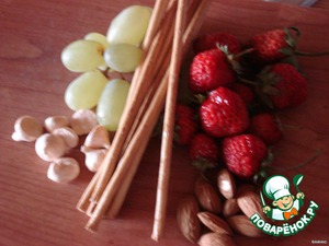 Соломку измельчаем на небольшие кусочки и заливаем их вином. Клубнику деле пополам, одну часть растираем в пюре и смешиваем с половиной взбитых сливок, а вторую часть нарезаем кубиками. Также нарезаем все фрукты.