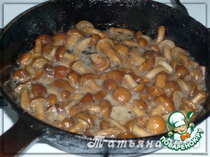 Пока супчик вариться, на сковороде обжариваем в растительном масле грибочки, у меня были мороженые опята.