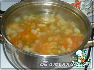 А тем временем режем средний кабачок кубиками, трем морковку, открываем банку с зеленым горошком. Все это добавляем в подсоленную воду.