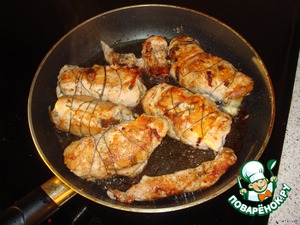 Каждый рулетик перетянуть ниткой и обжарить до готовности. Потом снять нитки (они снимаются легко).