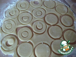 Из муки, сахара, ванильного сахара, масла и яйца замесить тесто. Скатать и убрать в холодильник на 30 мин. Духовку нагреть до 180 градусов. Тесто раскатать в пласт толщиной в 0,5 см. Формочкой вырезать круги. У половины кружочков вырезать отверстия в серединках.