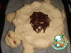 Достать пирог, середину посыпать тертым шоколадом. Начиная с краев по периметру аккуратно выкладывать кружочки теста.