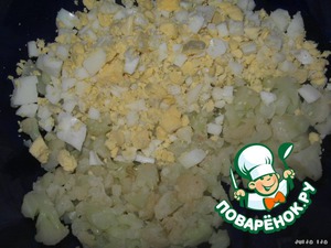 Цветную капусту и яйца отварить. Капусту в подсоленной воде, до готовности. Яйца - вкрутую.