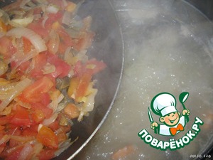 В воду положить форель, нарезанную на кусочки, и сварить бульон. Варить, как обычный бульон, снять пену, посолить слегка - по вкусу. У меня был рыбный бульон, который только сварился (рыба пошла в другое блюдо), потому я его не остужая использовала для супа, и закладывала форель в кипящий бульон.