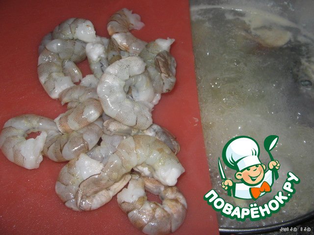Когда картофель будет практически готов, добавить очищенные креветки.