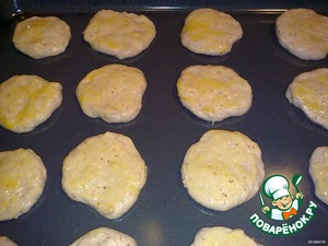 Из теста лепим шарики, придавливаем, чтобы получилась лепешечка, укладываем на противень. Противень можно не смазывать Сверху я покрыла яичным желтком, но это не обязательно. Выпекать в разогретой духовке при 180* минут 10-15. Не скажу, что до румяности. Печеньки пропекаются, но все же остаются бледненькими. На вкус это не влияет