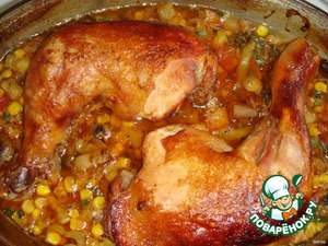 Зелёный лук измельчить. Кукурузу откинуть на дуршлаг и дать жидкости стечь. Окорочка аккуратно достать, к овощам добавить лук и кукурузу и вернуть мясо обратно. Поставить снова в духовку на 15 мин, но уже без крышки!