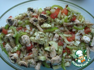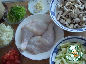 Огнеупорную форму смазываем растительным маслом. Лук и чеснок чистим и измельчаем. Стручки сладкого перца очищаем от семян и режем кубиками или соломкой. Шампиньоны моем и режем на четвертушки. Цуккини чистим и режем соломкой. Курицу натираем солью, перцем, молотой паприкой и немного обжариваем с двух сторон на растительном масле.