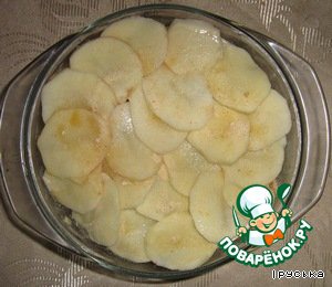 Огнеупорную посуду смазать выдавленным чесноком и налить в нее немного масла. Выложить на дно нарезанный тонкими ломтиками картофель.