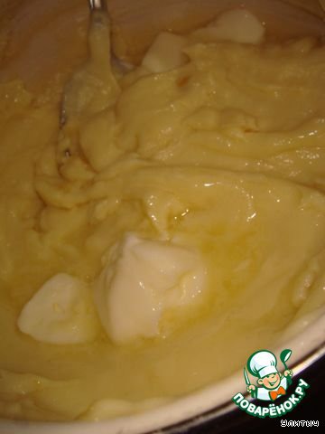 Ставим на водяную баню и варим помешивая до загустения.Даем чуть-чуть остыть и вводим масло.Остывшим кремом наполняем эклеры.