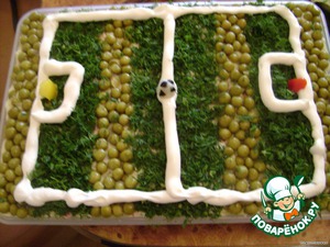 Все слои промазывать майонезом.Украсить зел.горошком,рубленным укропом.Майонезом нарисовать разметку.Из редиски сделала мячик и из чёрной оливки на мяч вырезала меточки.Вратарей из болгарского перца.Я считаю,что так можно украсить в принципе любой салат.Приятного аппетита!Кружок в середине поля добавила по просьбе племянника,сказал что его не хватает