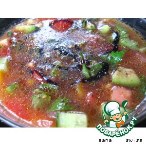 Добавляем бульон или минеральную воду, уксус, оливковое масло, "табаско", соль и перец, перемешиваем и охлаждаем перед употреблением.