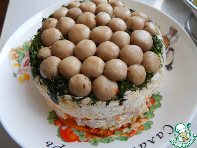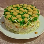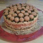 P. S. Для того, чтобы легче было отделить салат из eмкости, я промазываю еe маслом растительным и покрываю пищевой плeнкой, только потом выкладываю слоями салат. Попробуйте!