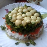 8 слой – картофель, натертый на крупную терку, майонез, еще немного картофеля. Затем в холодильник и через 5 часов перевернуть на плоское большое блюдо).