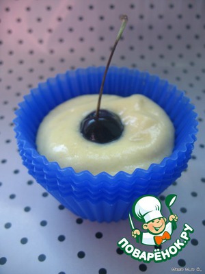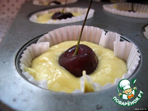 Тесто выложить в формочки для кексов на 2/3, сверху выложить черешенку и чуть вдавить. У меня есть отдельные силиконовые формочки – очень удобно.