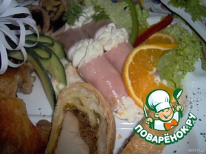 здесь крупным планом видно окорок тонко порезан и закручен в трубочку,внутри творог с чесноком.