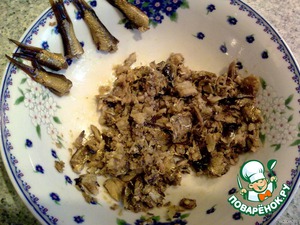 • Шпроты мелко порубить, оставив хвостики для украшения (не обязательно).
