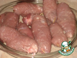 Мясные ломтики скрутить в рулетики и закрепить края зубочистками, чтобы не вываливалась начинка.