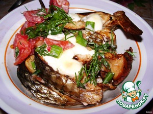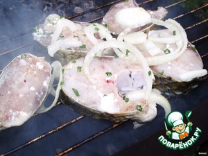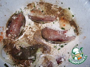 Рыбу почистить, помыть, нарезать ломтиками толщиной 1-1.5 см. Натереть солью, перцем. Залить маринадом, поставить для пропитки на 1.5 часа. Маринад: в тепловатую воду добавить майонез, специи, лук, зелень. Можно добавить лимонный сок.