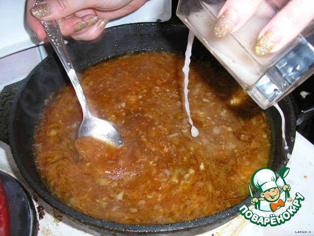 Постепенно ввести разведенный крахмал, постоянно помешивая и следя за густотой. Не "переборщите" с крахмалом, иначе соус будет очень густым.