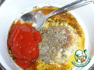 Смешать в отдельной посуде: АДЖИНОМОТО, кунжутное масло, выдавленный через чесночный пресс чеснок, перец, кетчуп, соевый соус, перемешать