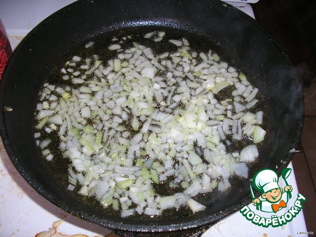 лук мелко нарезать кубиками и слегка припустить на сковороде в оставшемся после жарки масле (лук должен стать прозрачным, но не зажаристым) -