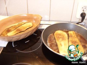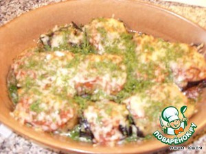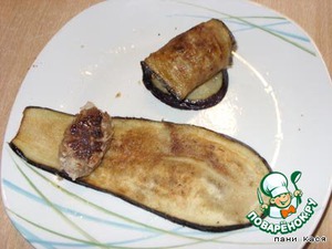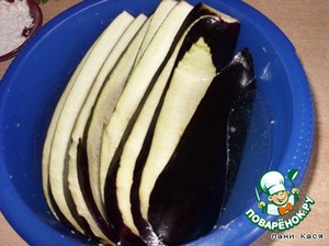 Баклажаны порезать вдоль пластинками, замочить в холодной солeной воде на 20 -30 мин. ( 1 литр води- 1 сл. л. соли)