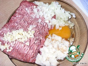 В фарш добавить хлеб, лук, яйцо, чеснок и уксус.