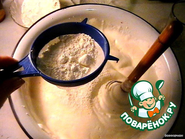 Так же как и сахар, в 3-4 приема, добавляем муку, просеивая ее через сито. Взбивание теперь не такое интенсивное, чтобы мука не разлеталась, но скорее перемешивание веничком.