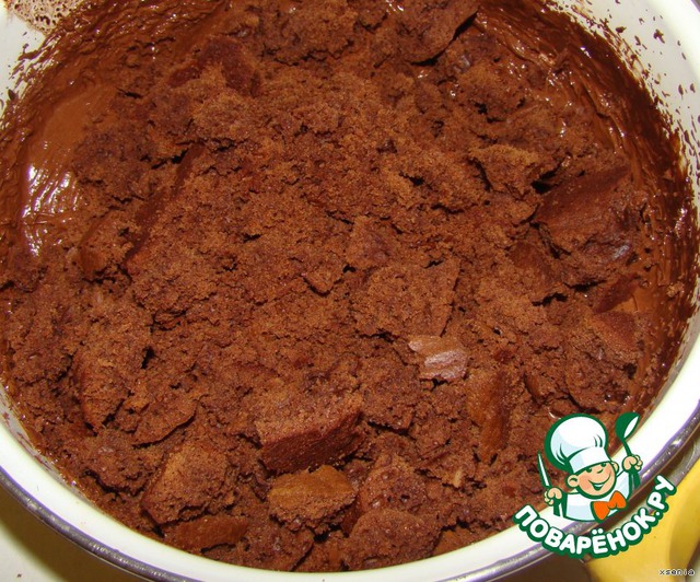 Наша шоколадная масса полностью остыла. Взбиваем ее до крутой пены. И крошим в нее бисквит. Хорошо перемешиваем. Вы можете не выпекать и не добавлять бисквит. Второй слой сделать просто из шоколадного мусса. Тогда десерт будет еще более нежным.