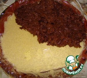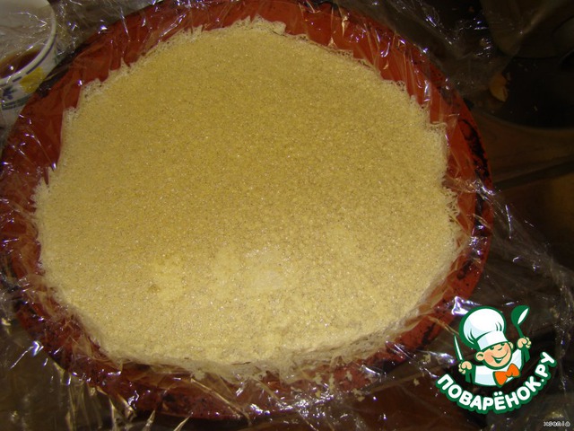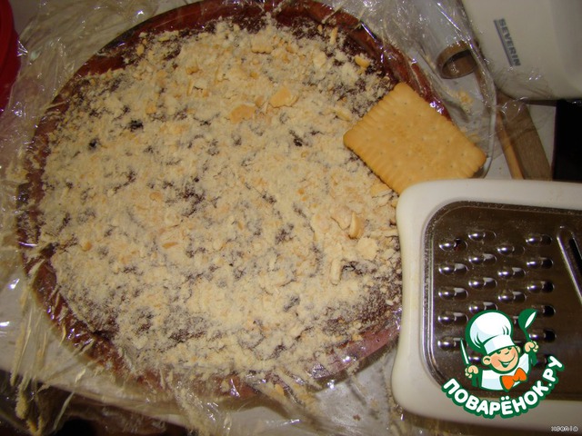 Можно посыпать тертым сухим печеньем. Закрываем пленкой отправляем в холодильник. Затем переворачиваем на блюдо. Можно посыпать тертым шоколадом