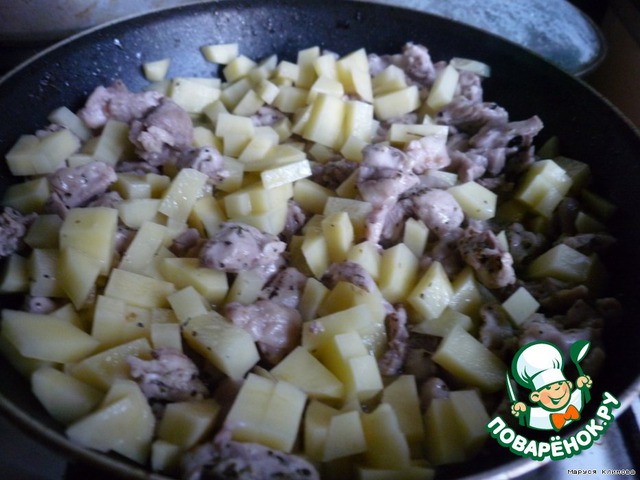 Картофель нарезать небольшими кубиками, добавить к мясу