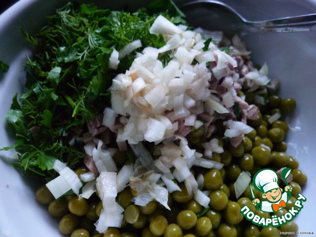 Из зеленого горошка слить жидкость, сам горошек выложить в салатник. Добавить мелко нарезанную печень трески