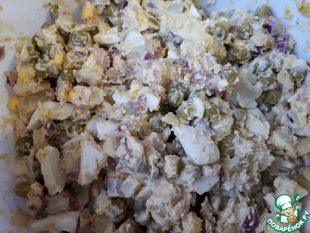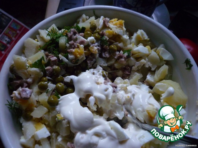 Добавить нарезанные кубиками картофель и яйца, посолить и заправить майонезом