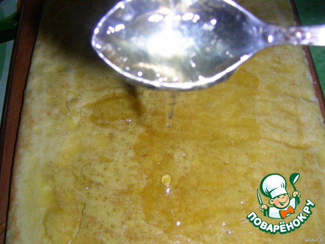 Переверните корж, снимите бумагу. Намажьте джемом. У меня лимонный, прозрачный. Рецепт лимонного джема я давала вот здесь: www.povarenok.ru/recipes/show/26156/