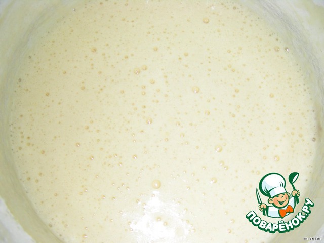 Взбейте яйца с сахаром в густой светлый крем (4-6 мин). Введите муку, разрыхлитель.