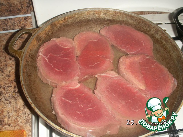 Вот вода у нас уже испарилась, в мясо добавляем топленое масло, начинаем обжаривать с двух сторон. В это время режим лук, довольно-таки крупно.