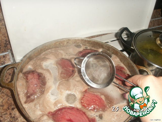 Снимаем пену, в бульон добавляем лавровый лист, перец горошком и немного солим. Накрываем крышкой, делаем маленький огонь и оставляем на 2-2.5 часа пока вода не испариться.