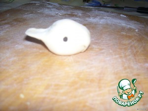 • заворачиваем рулетик.защипываем с двух сторон.с одной стороны формируем клюв(делать клюв как можно длиннее,при выпечке он сильно уменьшается),а с другой стороны подворачиваем под рулетик.глазки-горошины черного перца.это будет голова птички.