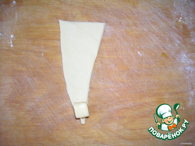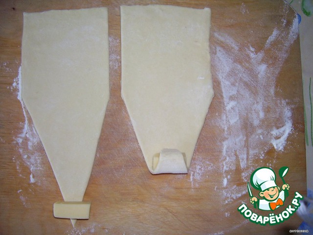 • на конец треугольника выкладываем брусочек сыра и заворачиваем.