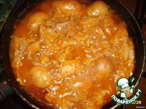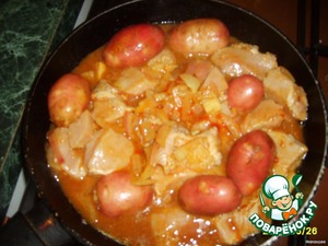 Добавляем мелкую картошечку, накрываем крышкой и тушим.