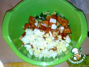• 2. Помидоры обдать кипятком снять шкуру, порезать. Добавить мелко нарезанные яйца.